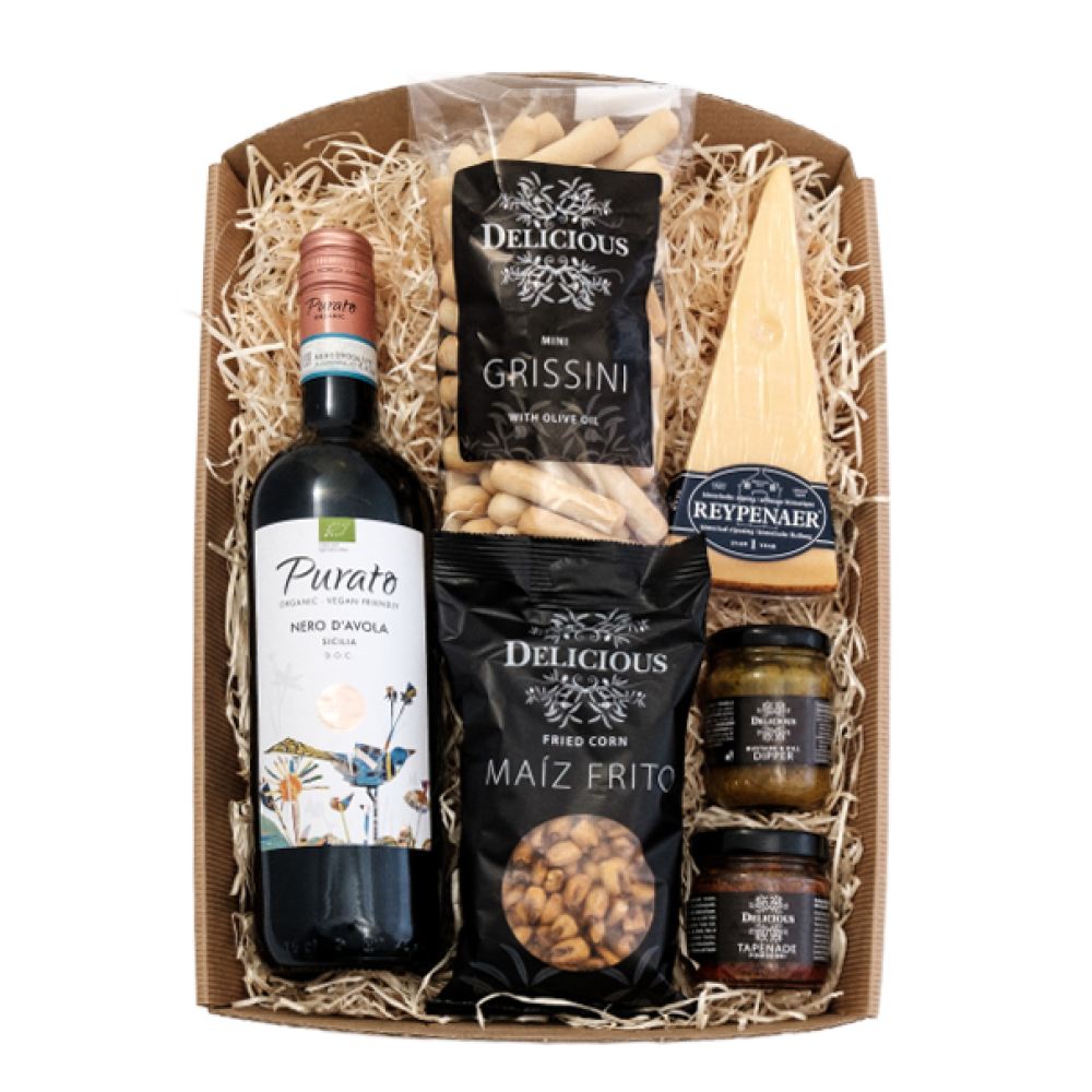 Heerlijke Italiaanse wijn, kaasdip, tapenade, Reypenaer kaas, Maiz Frito, en dipstokjes.