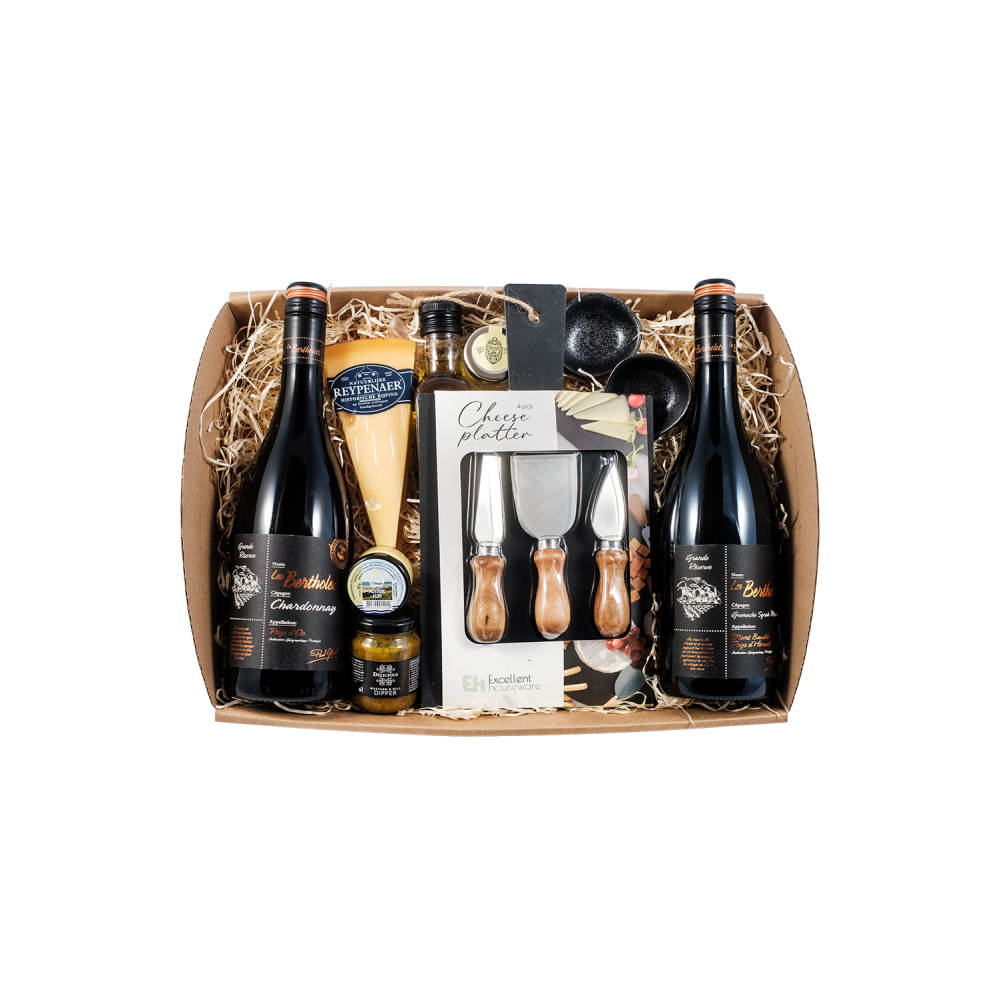 Les Bertholets Grande Reserve Chardonnay en GSM rouge, samen met Reypenaar kaas, een prachtige leisteen kaasplank compleet met 3 messen. Kaasmosterd, kaasdip 2 zwarte tapasschaaltjes en Zeeuws Zeezout maken het pakket compleet voor een fantastisch aperitief..