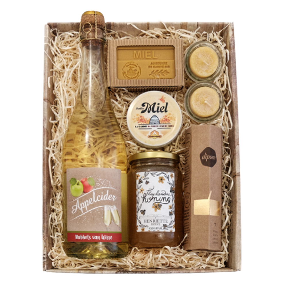 Appel- of perencider van Het Kraampje van Wisse, honingzeep, honingsnoepjes, honing van de Henriëttehoeve, 2 bijenwaskaarjes in waxineglas, en 6 bijenwaskaarsjes in verpakking.