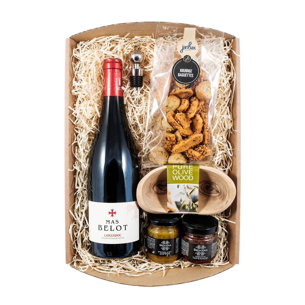 Heerlijke Zuid Franse wijn met kruidige baquettes van Jan Bax, olijf houtenschaaltje, tapenade, kaasdip, en wijnstop.