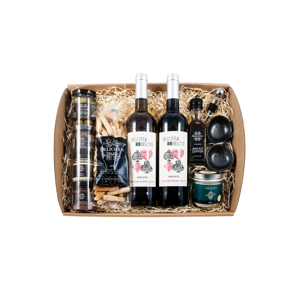 Een mooi relatiegeschenk met rode en witte wijn, met dipstokjes en een tapastoren met tapenade, aïoli en pesto, Spaanse olijven, brooddipper met 2 tapasschaaltjes en Zeeuwse Zoute.