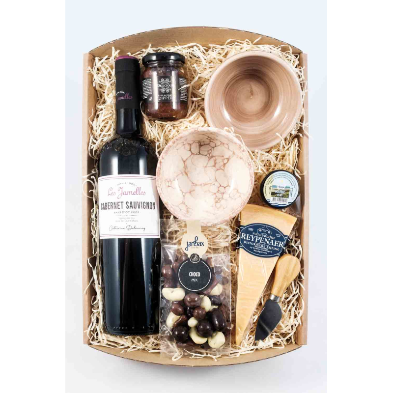 Een leuk cadeau voor een dame, Een heerlijke fles wijn, Franse zeep met zeepbaje van kokosnoot, Zeeuwse chocolade, frambozenjam van 't Siepje, en kruidige baquettes van Jan Bax.