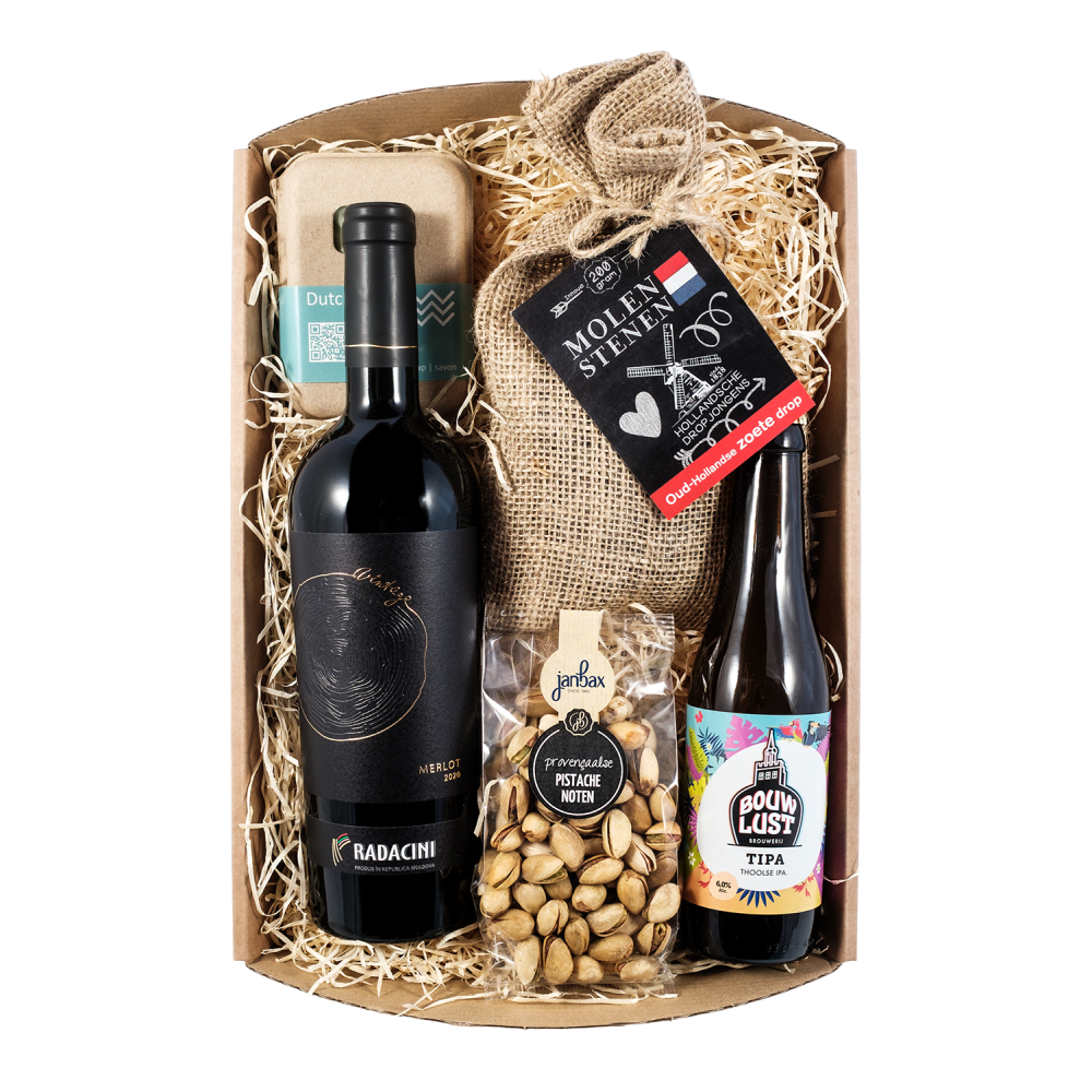 Een leuk cadeaupakket voor een heer. Met:een houtegerijpte wijn, Bodybar met Zeeuws Zeezout van Dutch Soap, Bouwlust Tipa bier, provencaalse pistachnoten, en molenstenendrop.