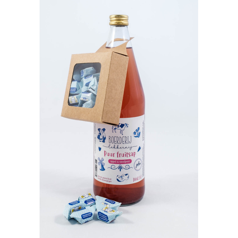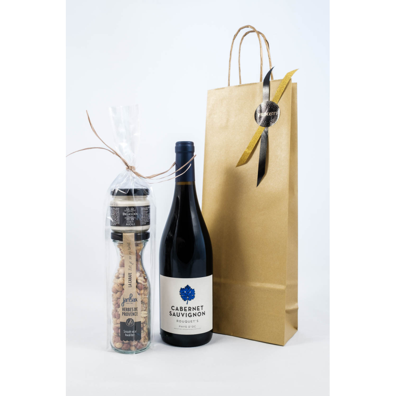 Een houtgerijpte wijn van Les Jamelles ( of een andere naar keuze) met Reypenaar kaas, kaasmosterd en een kaasmes, Twee tapasschaaltjes, choconotenmix van Jan Bax, kaasdip van Delicious Food & Gourmet.samen in een mooie verpakking.