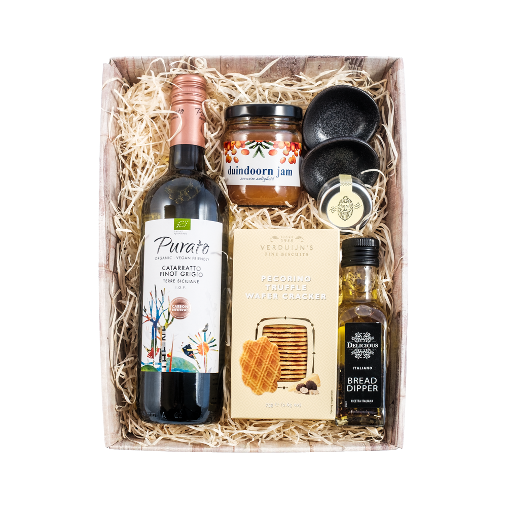 Heerlijk genieten wordt dit met dit prachtige wijngeschenk. Een Purato Nero d'Avola uit Sicilië, met kaascrackertjes, broodipper met Zeeuwsche Zoute met 2 tapasschaaltjes. De duindoornjam uit Zeeland ( Zeeuwse Zaligheid) maakt dit pakketje af, deze is heerlijk bij milde kazen.
